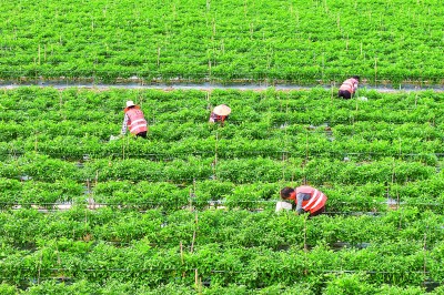 近年来,湖南省益阳市南县将水果玉米、辣椒、菜薹等作为区域种植品种大力推广。截至目前,该县秋冬套种蔬菜种植面积达18万亩。图为10月14日,在南县华阁镇新安村种植基地,村民抢抓时节采摘辣椒。新华社记者 陈思汗摄